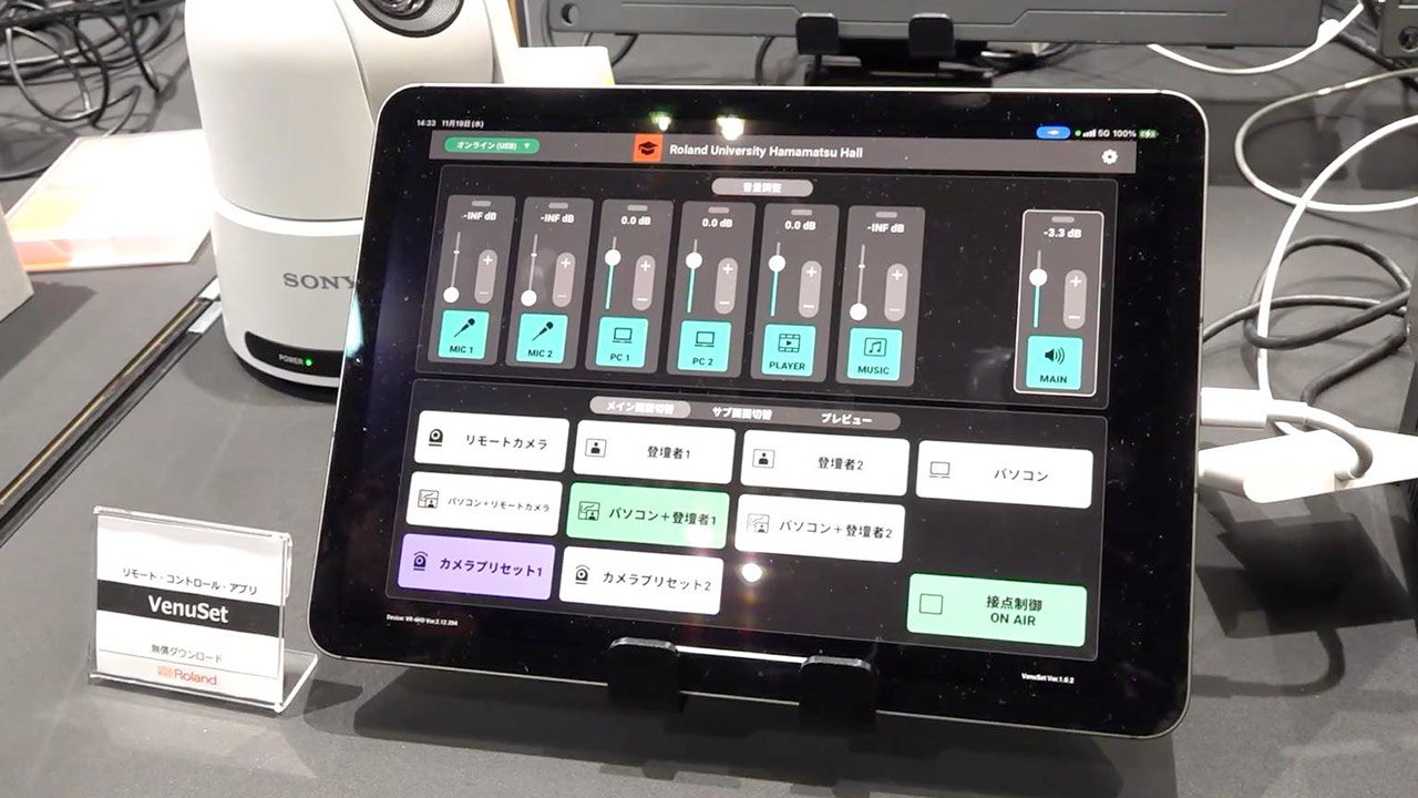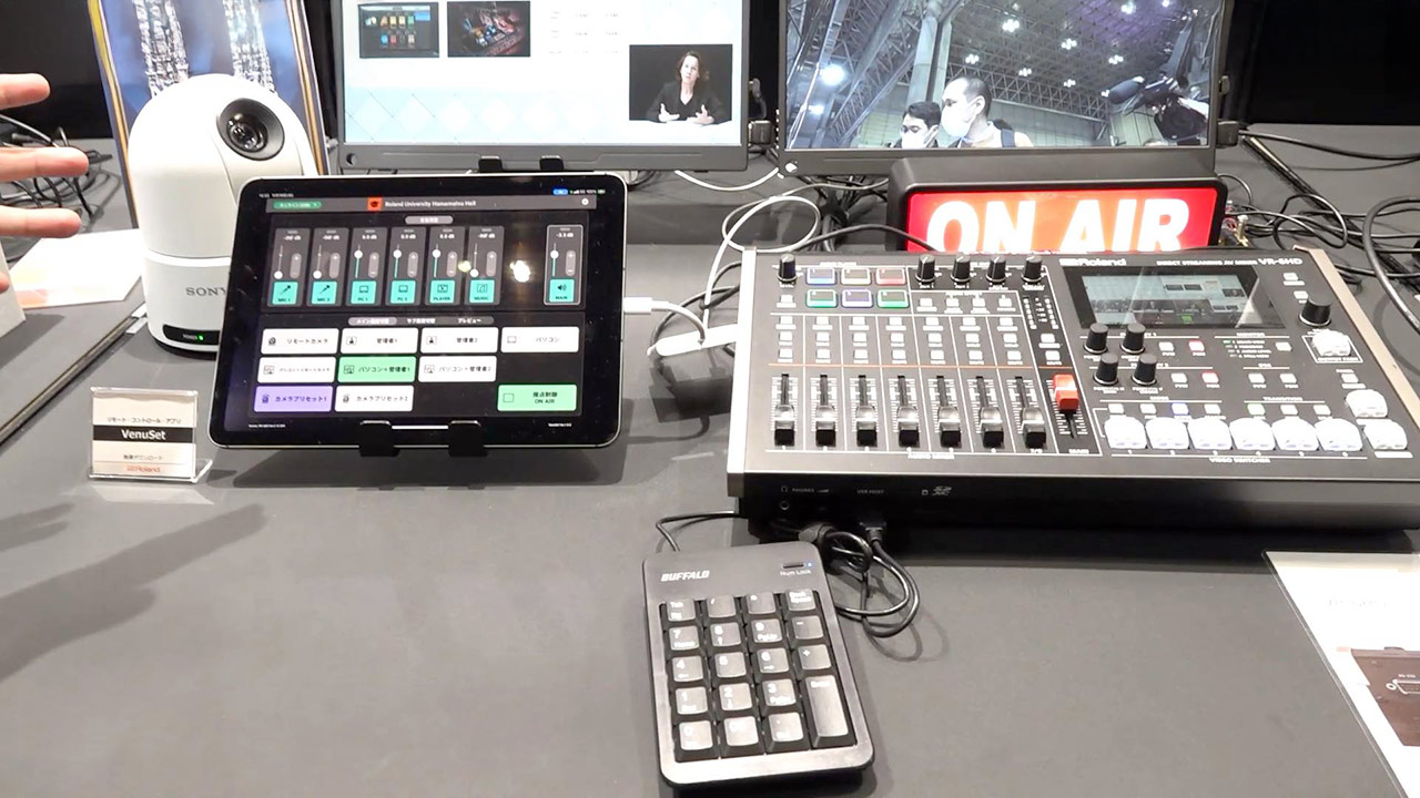 Another big player showcasing broadcasting gear at Inter BEE 2025 is Roland. The company had three themes for this event, and the first of these was a corner showcasing solutions for AV equipment in businesses and schools. What I found interesting here was the combination of an AV mixer designed for use in seminar rooms and streaming studios, and the VenuSet application that controls it.