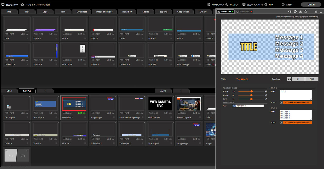 Roland’s proprietary Roland Fill/Key function allows you to connect a PC with Graphics Presenter installed to a video switcher or AV mixer with just a single HDMI cable. A wide variety of templates ideal for producing events and sports are available, and by selecting and editing the template that suits your preferences, you can easily compose high-quality titles and graphics in real time.
